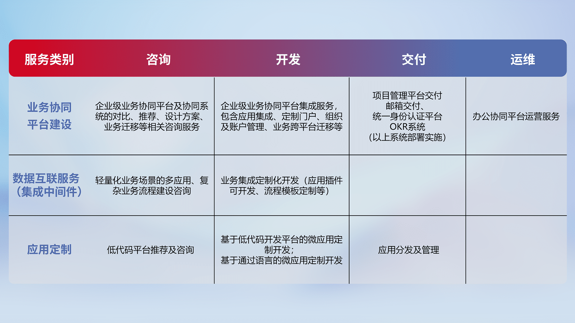 针对钉钉、、、企微、、、、IDaas等平台级产品提供产品的规划、、、、方案、、、、交付、、、定制化开发等服务,,实现如统一协同办公、、、智能客户服务、、、、混合会议管理、、、智能数据查询、、、等业务场景,,,,实现数字化转型。。